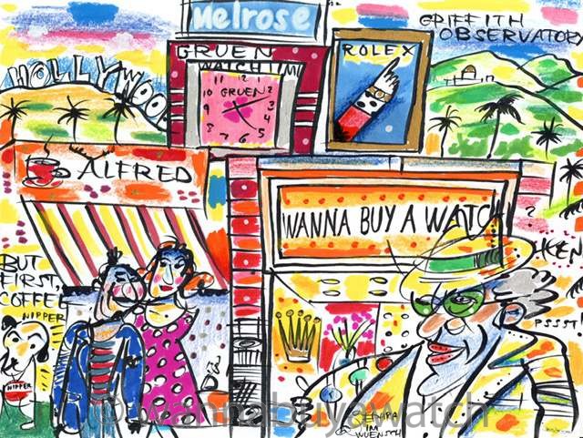 We tracked down the artist Ephraim Wuensch and he kindly agreed to create a large custom image of our landmark store on Melrose Ave in West Hollywood featuring this notorious character! We asked him to include other popular elements of our store and surroundings. We were delighted with the results. And now this colorful and imaginative piece hangs proudly in our showroom.